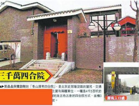 現(xiàn)在,越來越多的跡象都在表明郭晶晶和霍公子的婚期已近。昨天,香港一媒體爆出郭晶晶正準(zhǔn)備裝修去年霍家所贈的價(jià)值3000萬人民幣的豪華別墅,并稱“這很有可能就是他們倆在北京的婚房!”據(jù)說,這套別墅位于北京海淀區(qū)四季青鎮(zhèn)門頭村,在五環(huán)以外。據(jù)記者了解,該樓盤的中式院落獨(dú)棟別墅面積為300—550平米之間,另外,每棟別墅送150平米的地下室。該別墅在2007年的預(yù)估開盤價(jià)就高達(dá)55000—60000元/平米。難怪媒體都將這一帶的房子稱作“北京頂級私人豪宅群落!