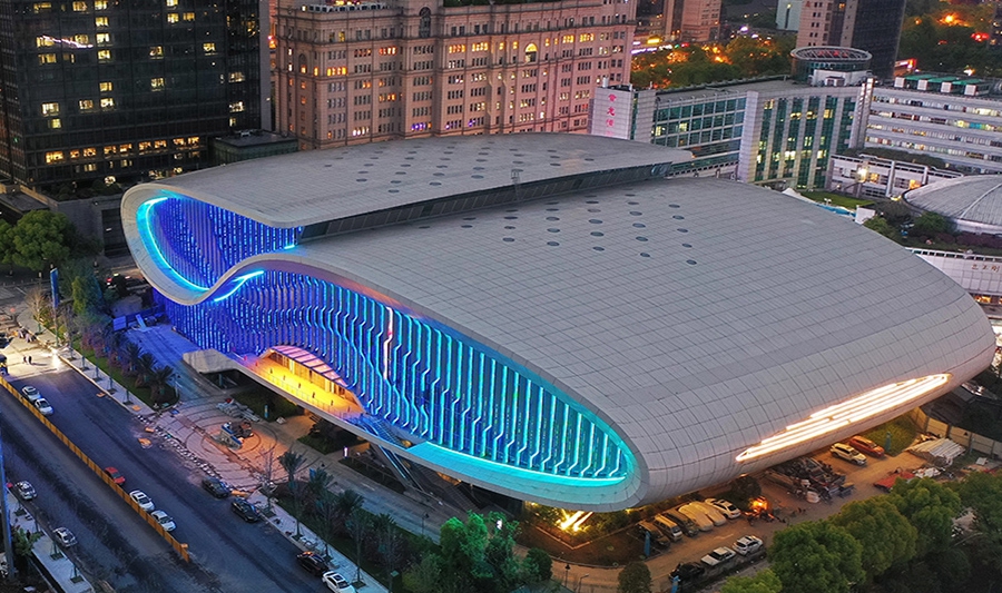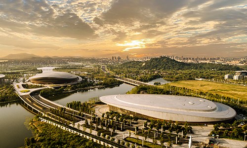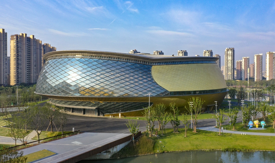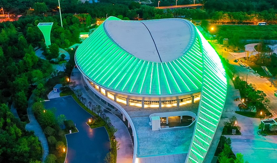 杭州奧體中心游泳館為亞運(yùn)會(huì)游泳、跳水、花樣游泳項(xiàng)目比賽場(chǎng)館及訓(xùn)練場(chǎng)館,位于杭州市蕭山區(qū),總建筑面積53959平方米,觀眾席位數(shù)約6000個(gè),是一個(gè)集游泳、跳水比賽和訓(xùn)練為一體的專(zhuān)業(yè)運(yùn)動(dòng)場(chǎng)館。場(chǎng)館擁有雙館合一的設(shè)計(jì)理念、獨(dú)特的流線(xiàn)造型,結(jié)合雙層全覆蓋銀白色金屬屋面,和兩翼張開(kāi)的平臺(tái)形式……作為世界上最大的兩館連接體非線(xiàn)性造型場(chǎng)館,無(wú)論白天夜晚,顏值都超高。