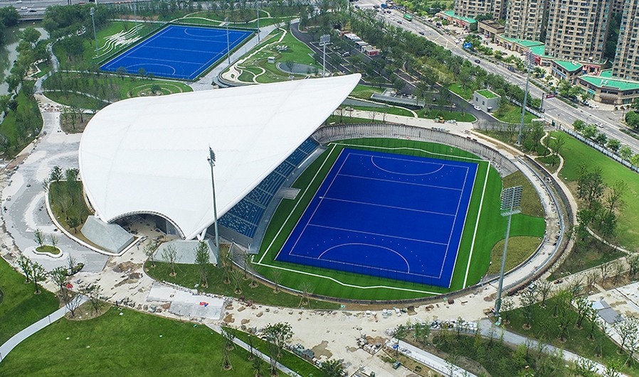拱墅運(yùn)河體育公園體育場(chǎng)為亞運(yùn)會(huì)曲棍球項(xiàng)目比賽場(chǎng)地,位于杭州市拱墅區(qū),在亞運(yùn)村西北方向且相距約14.5公里,含主比賽場(chǎng)和熱身場(chǎng)、兩層賽時(shí)配套用房,賽后將作為游客接待中心使用??偨ㄖ娣e27121平方米,觀眾席位數(shù)4870座。