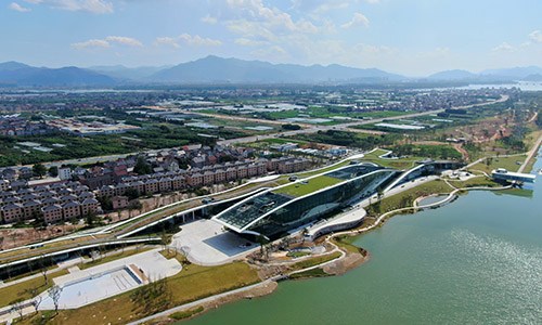 溫州龍舟運(yùn)動(dòng)中心為亞運(yùn)會(huì)龍舟項(xiàng)目比賽場(chǎng)地及訓(xùn)練場(chǎng)館,位于溫州市甌海區(qū),含綜合館、終點(diǎn)塔及觀龍臺(tái)。龍舟競(jìng)渡在溫州已有二千年歷史,溫州市被稱(chēng)為“中國(guó)龍舟名城”,該基地賽后將永久性保留,作為全國(guó)最專(zhuān)業(yè)的龍舟競(jìng)賽基地??偨ㄖ娣e23713平方米,觀眾席位數(shù)344座,沿河兩岸約有20000個(gè)站席。