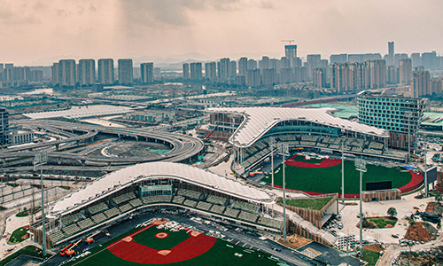 紹興棒(壘)球體育文化中心為亞運(yùn)會(huì)棒壘球項(xiàng)目比賽場(chǎng)地,位于紹興柯橋區(qū)和鏡湖新區(qū)交界處、杭紹臺(tái)高速公路鏡湖互通附近。其中,棒球項(xiàng)目用地面積 120666平方米,總建筑面積 145000 平方米,其中地上建筑面積89200平方米,地下建筑面積55800平方米。功能區(qū)包括一個(gè)棒球主場(chǎng)(座位數(shù)5000個(gè)),一個(gè)棒球副場(chǎng)(座位數(shù)2500個(gè)),一個(gè)集訓(xùn)中心和一個(gè)體能訓(xùn)練館。壘球項(xiàng)目用地面積 42666平方米,建筑面積8000平方米,含一個(gè)壘球主場(chǎng)(座位數(shù)2000個(gè)),一個(gè)壘球副場(chǎng)(座位數(shù)500個(gè))。