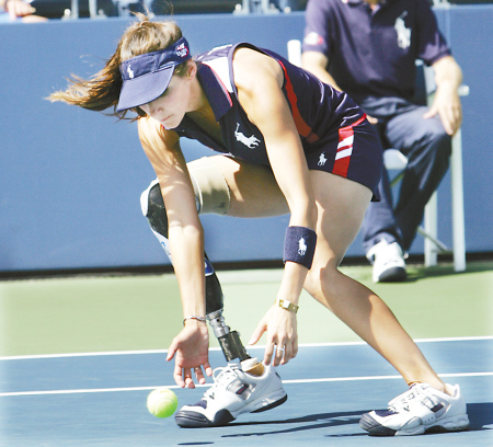 美網(wǎng)舉辦地一共有15塊比賽場(chǎng)地,在少有大牌明星現(xiàn)身的14號(hào)場(chǎng)地,有一位球童受到的關(guān)注,甚至比在這里比賽的球員還要多,為她,美國(guó)大報(bào)《紐約時(shí)報(bào)》專(zhuān)門(mén)刊發(fā)了一篇人物特寫(xiě)——24歲的凱莉·布魯諾,她每次沖進(jìn)場(chǎng)地、撿球、跑到球網(wǎng)另一端站好,和美網(wǎng)其他72位球童一樣?jì)故,但她每次完成任?wù)后都會(huì)有一個(gè)額外的小動(dòng)作:伸直右腿、下壓,調(diào)節(jié)那上面的氣壓閥——那是一條義肢。