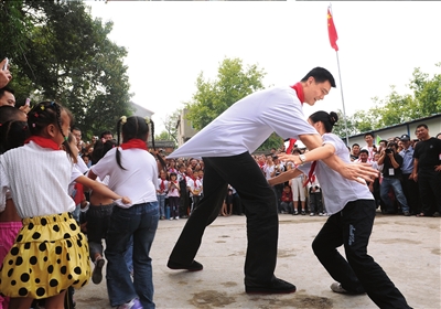 游戲開(kāi)始了,一位高年級(jí)同學(xué)當(dāng)老鷹,姚明則當(dāng)雞媽媽,其他的同學(xué)做小雞。姚明張開(kāi)雙臂,彎著身子,直視前方,掩護(hù)著正在身后休息的孩子們。不一會(huì)兒,兇猛的“老鷹”如猛虎出山似地飛過(guò)來(lái),用左晃晃、右看看,想要出擊卻找不到合適的機(jī)會(huì)。正當(dāng)大家有些松懈的時(shí)候,“老鷹”猛地一陣,展開(kāi)有力的翅膀向姚明身后的孩子們發(fā)動(dòng)了襲擊。姚明左顧右盼,進(jìn)行有力阻擋,但是一不留神,后面的孩子們突然掉隊(duì)!袄销棥表槃(shì)活捉了離隊(duì)的孩子們!翱靵(lái)救我!”聽(tīng)到孩子們的呼喊,姚明立即轉(zhuǎn)了方向,趕走身后的“老鷹”。場(chǎng)上玩的開(kāi)心,場(chǎng)下也看得開(kāi)心,加油聲、歡笑聲回蕩在小小的校園內(nèi)。兩個(gè)回合下來(lái),雖然有些疲倦,但是姚明和小孩們都還不盡興,再次回到場(chǎng)內(nèi)過(guò)把癮。當(dāng)裁判老師一聲哨響宣布結(jié)束時(shí),姚明才有些戀戀不舍地回到了座位。(徐楊 陶玲 彭晗)