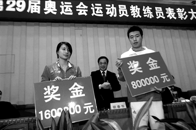 昨天,河北省政府表彰在北京奧運(yùn)會(huì)上取得優(yōu)異成績的河北運(yùn)動(dòng)員及其教練。獲得跳水3米板單人項(xiàng)目和女子3米板雙人項(xiàng)目兩枚金牌的運(yùn)動(dòng)員郭晶晶(左)及其教練李芳、獲得射擊男子10米氣手槍金牌的運(yùn)動(dòng)員龐偉(右)及其教練員張勝閣被授予“河北省優(yōu)秀體育工作者”榮譽(yù)稱號(hào),同時(shí)受到經(jīng)濟(jì)獎(jiǎng)勵(lì)。