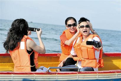 當(dāng)然,昨日彩排的時候,5位伴郎還沒有抵達三亞,而且楊威的海上旅程和楊云的空中旅程分開彩排。因此,在這一環(huán)節(jié),楊威、楊云和孫曉姣同坐一條艇,而本報兩名記者和楊威、楊云的隨行人員則客串伴郎分乘另外三條艇,來了一次海上“漫步”。