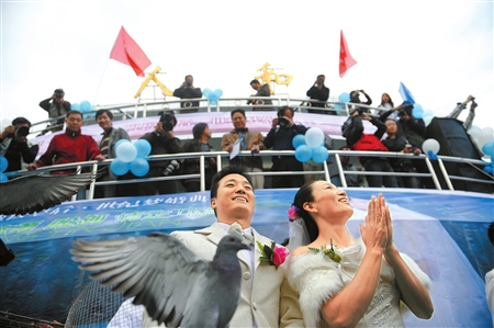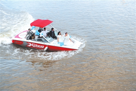 隨后,新郎牽著新娘的手,雙雙登上游艇。新郎正是四川激流回旋隊教練陳勇,新娘則是奧運帆板冠軍殷劍。昨日,這對幸福的新人,在現(xiàn)場近千人的祝福聲中步入了婚姻的殿堂。自此,享譽(yù)世界的帆板奧運冠軍也有了自己幸福的港灣。