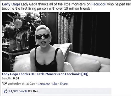 榮登在世人氣女王,她向粉絲發(fā)twit說(shuō):“多謝那么多小魔怪在facebook追隨我。我有1,000萬(wàn)個(gè)互相緊扣的朋友!毙∧Ч謑ittle monsters,正是她給粉絲的昵稱(chēng)。