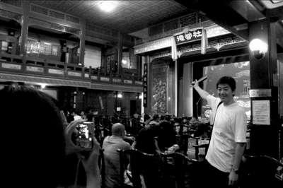 晚上7點(diǎn),記者購(gòu)票進(jìn)入演出大廳,此時(shí)一層上座率達(dá)到四成,二層觀眾寥寥無(wú)幾。一些觀眾掏出相機(jī)、手機(jī)在臺(tái)前合影留念。一個(gè)小伙子擺出搖扇子的造型,一邊指揮女友往后站拍全景,一邊自言自語(yǔ):“不知道哪天再開(kāi)業(yè),先留個(gè)影兒吧!