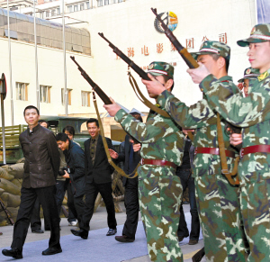 繼在北京舉行了盛大的首映禮之后,《集結號》主創(chuàng)一行十多人又馬不停蹄地來到上海展開宣傳活動。19日下午,新聞發(fā)布會選擇在上海電影集團5號攝影棚進行。在馮小剛帶領“谷子地”張涵予、廖凡、王寶強、任泉、袁文康、李乃文等主創(chuàng)入場時,武警戰(zhàn)士還鳴槍歡迎。整個發(fā)布會現(xiàn)場也布置成了片中硝煙彌漫的“戰(zhàn)場”,有沙袋、機槍、戰(zhàn)壕等。發(fā)布會后男主創(chuàng)們還乘敞篷吉普車和軍用卡車前往首映的電影院。