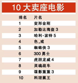 今年臺灣地區(qū)電影市場賣相強勁,是好萊塢續(xù)集片當?shù),但包括《加勒比海盜3》、《哈利·波特5》、《蜘蛛人3》、《虎膽龍威4》、《諜影重重3》都是續(xù)集片。還好有《色,戒》為華語片爭光,擠進10大。該片在美國被列為NC-17級,票房雖然僅430萬美元(約3170萬人民幣,下同),但在香港票房近5000萬元,臺北市票房約3400萬元,臺灣地區(qū)約6500萬元,締造李安個人最高票房紀錄。