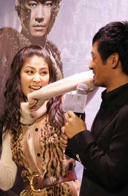 《江山美人》也是三個(gè)男人和一個(gè)女人的故事,陳慧琳在戲里受到郭曉冬的“陷害”,戲外,陳慧琳為了“報(bào)仇”,先發(fā)制人對(duì)郭曉冬發(fā)起了“攻擊”,但到最后還是被郭曉冬“欺負(fù)”。