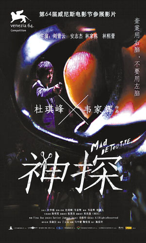 《神探》由杜琪峰和韋家輝共同導(dǎo)演,劉青云、安志杰、林熙蕾主演。2007年該片曾在最后一刻入圍參加威尼斯電影節(jié),被稱為“驚喜電影”。其后,該片于2007年11月在香港上映,在今年1月公布的第27屆香港電影金像獎(jiǎng)上也獲得8項(xiàng)提名。劉青云在片中扮演一位擁有特異能力的退職警察,受安志杰邀請(qǐng)重新出山破案。而在片中扮演劉青云太太的是林熙蕾,在片中她飾演兩個(gè)角色,一方面是劉青云太太,另一方面是劉青云幻想出來(lái)的人物。