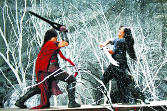 發(fā)布會(huì)當(dāng)天拍攝的是聶風(fēng)和步驚云的最后一場(chǎng)雪中決斗戲,這也是全片的一場(chǎng)重頭戲。在拍攝時(shí)還發(fā)生了一點(diǎn)“意外”,鄭伊健的劍不小心打到了郭富城的頭上,現(xiàn)場(chǎng)工作人員非常緊張,郭富城安慰大家說沒關(guān)系,沒流血,結(jié)果拍攝結(jié)束,郭富城摘掉假發(fā)后才發(fā)現(xiàn),被打到的地方竟然腫得老大,郭富城打趣道:“腫得像乒乓球,就當(dāng)迎接奧運(yùn)了。”