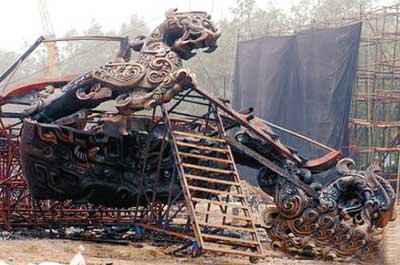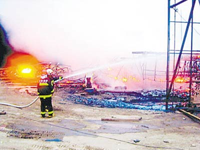 9日凌晨3時(shí)許,《赤壁》劇組在北京小湯山國(guó)家農(nóng)業(yè)科技園內(nèi)拍攝時(shí)發(fā)生火災(zāi)。目擊者稱(chēng),現(xiàn)場(chǎng)被燒毀的兩艘仿古戰(zhàn)船只剩下鐵骨架,另有一艘約12米長(zhǎng)的道具船船頭損毀,場(chǎng)地上搭建的背景綠屏也燒毀了一大半。