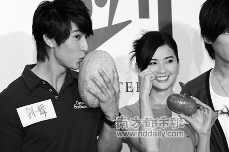 昨天下午,《劍蝶》劇組在北京舉行媒體答謝酒會,導演馬楚成率阿SA、吳尊、胡歌等主創(chuàng)亮相!秳Φ芳磳⑶,答謝會也成了劇組人員的告別宴,劇組準備了一筐蔬果做告別禮物,阿SA和吳尊給對方挑的禮物,讓人不禁啼笑皆非。