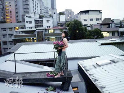 為了表達“花與女孩”的主題,林嘉欣裸露上半身,只以長發(fā)遮掩胸部,照片的確很有味道,一點色情感覺都沒有。圖片均來自香港《明報》。