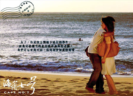 最近,臺(tái)灣很流行一句話:“你,海角了嗎?”源于一部賣座臺(tái)灣本土電影《海角七號(hào)》。目前,這部電影的票房已經(jīng)超過3.2億元新臺(tái)幣(約8000萬元人民幣),刷新了臺(tái)灣有正式票房統(tǒng)計(jì)以來華語電影票房的最高紀(jì)錄,不僅超過了《色,戒》,還一舉將16年前成龍主演的《超級(jí)警察》踢下冠軍寶座。據(jù)說,有影迷竟連看18遍,片中“永不放棄”的小人物成為了大家的“心靈雞湯”。難怪導(dǎo)演魏德勝發(fā)話:“別小看臺(tái)灣電影!”
