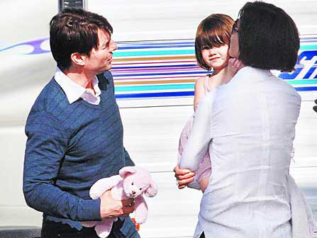 湯姆·克魯斯(左起)、舒莉和凱蒂·荷爾姆斯到片場(chǎng)探班。