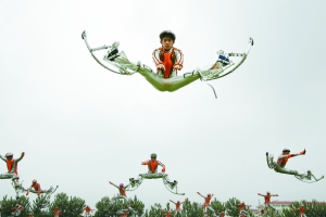 音樂聲中,他們一躍3米高,在空中自由翻著跟頭,做出各種高難度動作。