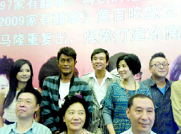 昨日下午杭州雨后天晴,如香港東方電影公司老總黃百鳴的心情,因?yàn)椤都矣邢彩隆废盗须娪霸陂焺e銀幕11年之后,終于有機(jī)會(huì)制造《家有喜事2009》。昨天該片在杭州舉行了開(kāi)機(jī)新聞發(fā)布會(huì),主演吳君如、古天樂(lè)、黃百鳴、鄭中基、姚晨、郭濤等等一干明星全體出席。