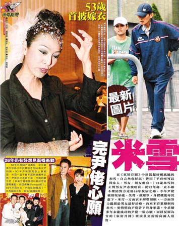 《家好月圓》的一幫演員聽聞米雪要嫁尹志強(qiáng)的消息后,紛紛提早道賀!癑o鮑”夏雨祝兩人白頭到老,家好月圓。與米雪私交甚篤的馬海倫,除了連聲叫好外,還失口爆料:“據(jù)我所知,他們會(huì)低調(diào)搞!
