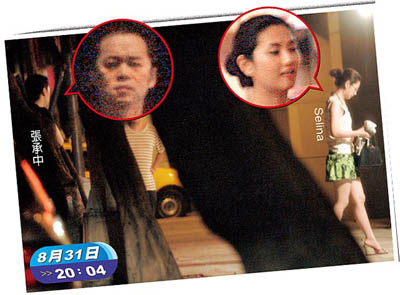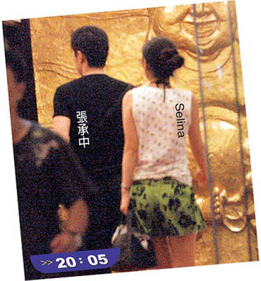 八月三十一日晚間八點(diǎn),張承中開著Selina的車來到臺北市敦化南路上的“驥園川菜館”,穿著短裙白背心的Selina則從副駕駛座下車,刻意低著頭走進(jìn)餐廳,而一身黑色休閑服的張承中,將車鑰匙交給泊車小弟后,也跟著Selina走進(jìn)餐廳,一路不停盯著遠(yuǎn)方看有無狗仔車,非常謹(jǐn)慎小心。