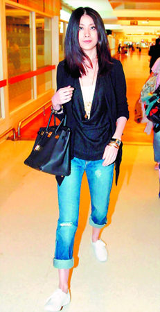 陳慧琳手提價(jià)值近8萬(wàn)港幣的愛(ài)瑪仕黑色皮手袋去臺(tái)灣開(kāi)工,她笑稱:“這包有一半來(lái)自雷頌德的禮金。”