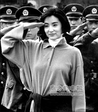 敬禮姿勢(shì),盡顯青春英氣。林青霞與武警戰(zhàn)士在一起。(樊甲山攝)