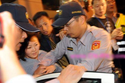 央視主播柴璐(灰衣)等媒體人員遭民眾圍堵辱罵,在警方保護(hù)下搭警車離開。