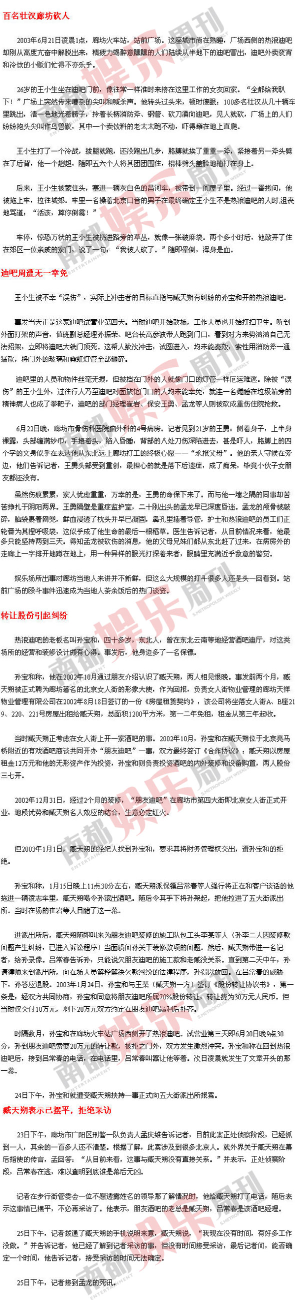 2003年的我正供職于京城某家在市場上享有盛譽的報社。那年夏天,孫寶和找到報社,拿了一大堆文字資料和現(xiàn)場照片,聲稱自己遭黑社會迫害,幕后主謀就是歌星臧天朔。當時報社在異地采訪問題上一直相當慎重,但沒想到很快就得到領(lǐng)導的充分許可。我和另一名攝影記者連夜趕往廊坊進行了一周多的調(diào)查。令我深感意外的是,這么大動靜的毆斗居然沒有第二家媒體介入,更談不上披露問題,相關(guān)的細節(jié)和猜想也僅在群眾中間悄然流傳,我們成了惟一到現(xiàn)場采訪的記者。