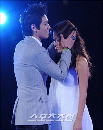 據(jù)體育朝鮮報(bào)道,15日晚7時(shí),在首爾蠶室室內(nèi)體育館舉行的“2008 Mnet-KM音樂(lè)節(jié)”( 以下簡(jiǎn)稱(chēng)“MKMF”)上,李孝利和T.O.P在共同演繹《謊言》時(shí),表演了兩個(gè)嘴唇互碰的熱吻場(chǎng)面。