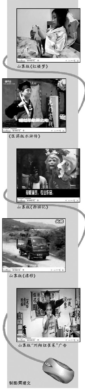 這只是近期眾多走紅網(wǎng)絡(luò)的網(wǎng)友自制影視劇中的一部。在電腦中輸入“山寨”一詞就會發(fā)現(xiàn),電視劇《水滸傳》、《西游記》,電影《大話西游》、《尋槍》、《頭文字D》,“優(yōu)樂美奶茶”、“劉翔紐崔萊”以及部分電視購物廣告,均被推出了山寨版。