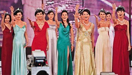 27位歷屆亞姐戴上后冠、穿上低胸裝在臺上高歌。