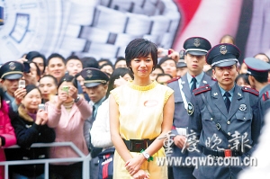 和郭富城上次來渝參加活動一樣,昨天下午,解放碑中心到郵局一段,被主辦方用鐵柵欄圍了起來,柵欄外的粉絲擠得水泄不通。不過老徐并沒有像某些明星一樣耍大牌,而是穿著一身無袖金色小禮服準時出現(xiàn)在現(xiàn)場,在10℃的低溫下赤膊上陣。粉絲們沒有上次郭天王來時聲嘶力竭的吶喊,倒是響起了各種評頭論足的聲音,大家最關(guān)注的是“徐靜蕾冷不冷”,當然也有一些大媽級的業(yè)余“粉絲”頗有些失望地表示,“完全是個小女孩兒嘛!”