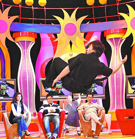 釋小龍(前)表演長拳、凌空騰起,讓朱延平(右起)、郝劭文和葉全真看呆了。