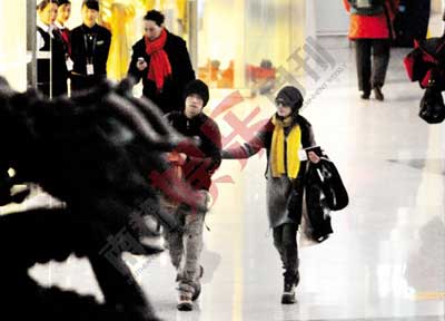 第二天凌晨5點,記者就爬起床來趕到夏雨公寓外守候。早晨7點20分左右,一對穿著厚重棉衣的男女拖著行李箱走出大門打車。記者一眼就認出他們就是夏雨和袁泉。兩人裝扮很有點情侶裝的感覺,都戴黑色毛線帽子、穿著鹿皮旅游鞋,一副出門遠游的樣子。除了兩個大的旅行箱外,夏雨還抱著一個長長的裝著滑雪板的紅袋子。夏雨和袁泉一起把行李放進出租車,然后上車朝機場方向駛去。到達機場后,夏雨先下車推來行李車放行李箱,袁泉一只手幫夏雨推車,一只手挽住夏雨的胳膊。他們進入機場大廳后先是辦理登機卡,然后托運行李,最后還兌換外幣。整個過程中,兩人很少交流,即使說話也是低聲細語,但表情輕松愉快。因為大廳里很熱,夏雨脫下羽絨服,而袁泉馬上幫夏雨接住背包,袁泉還幾次自然地挽住了夏雨胳膊,無意間流露了情感。當所有事宜辦好后,兩人并肩走進登機入口,開始了他們甜蜜的北海道滑雪之旅。