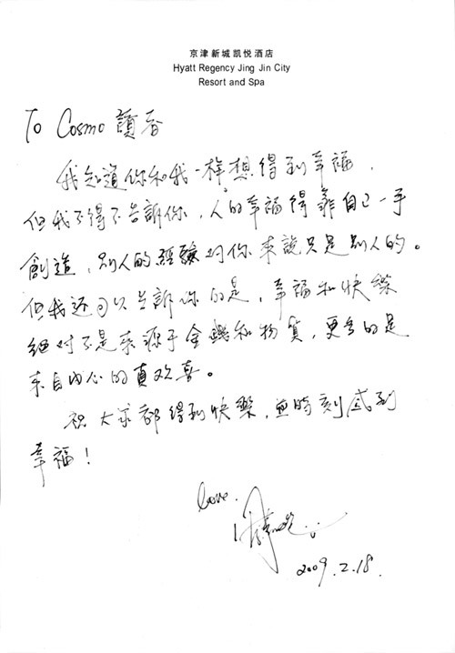 有做筆跡分析的朋友見過周慧敏的字。她寫道,她的字,是淑女之筆,品相和筆畫運勢上,都均勻而美觀,控制不夸張,足以見得周慧敏內(nèi)心的穩(wěn)定與成熟,懷抱著對一切美好的期許,或者遇到很多不如意,也還是堅持硬撐。