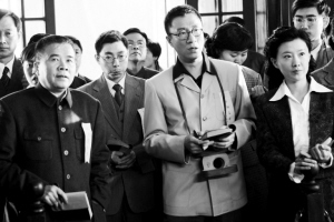 昨天拍攝的是1945年,毛主席和蔣介石在“陪都”重慶會面并召開記者會的場景。記者會被布置在車墩影視基地馬勒別墅的一樓大廳里。背景依舊是孫中山的畫像和“青天白日旗”。除了“老對手”唐國強和張國立外,孫紅雷身穿西裝演起了一名記者,雖然只有兩句臺詞,但他通過采訪“毛主席”和“蔣介石”,將當時的一名普通新聞記者的情緒表現(xiàn)得很到位。