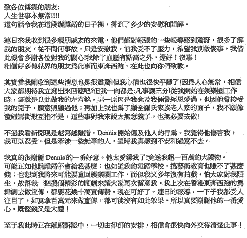 中新網(wǎng)6月19日電 羅啟仁發(fā)聲明揭太太李賽鳳和22歲的干兒子宗天意有不尋常關(guān)系,昨日李賽鳳首次發(fā)聲明響應(yīng)事件,她承認(rèn)正在辦離婚,但沒有交代和干兒子的關(guān)系,聲明中又暗損羅啟仁近日制造鬧劇,是為她重回娛樂圈造勢(shì),等如送她百萬(wàn)大禮。羅啟仁則向傳媒提供宗天意去年7月8日以“老公”的名義給“老婆”李賽鳳的電郵,以證明兩人在說(shuō)謊。