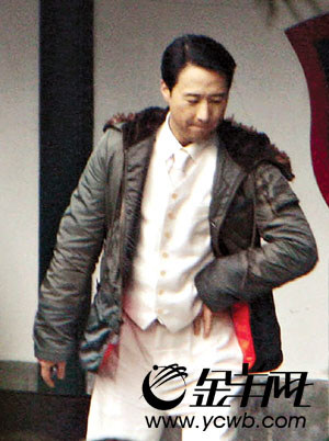 為免造型曝光,劇組人員相當小心,所有有可能被拍攝到的位置都以布幕封好。但百密一疏,在畫舫齋旁邊長廊盡頭,記者守候了一會,突然看見一名身穿白色西裝加軍綠色外套的男子出現(xiàn),原來正是穿上戲服的黎明。