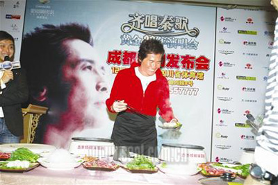 昨日新聞發(fā)布會(huì)的主題似乎是火鍋,而不是音樂(lè)。但其中的真意,齊秦非常明了:“這樣舉辦新聞發(fā)布會(huì),是想以朋友的方式和大家聊聊。在四川我做辣味火鍋拼不過(guò)你們,那我就做一個(gè)來(lái)自馬來(lái)西亞的胡椒螃蟹火鍋吧!饼R秦系上了圍裙,他面前擺滿了蟹肉、粉絲、肉丸子、蚌殼、蔬菜等燙料,5口蒸鍋正熱氣騰騰地翻滾著湯汁。曾經(jīng)在舞臺(tái)上激烈地高歌《九個(gè)太陽(yáng)》、《啞口》,曾經(jīng)長(zhǎng)發(fā)不羈的齊秦,曾經(jīng)在與王祖賢的愛(ài)情糾葛里被傳說(shuō)得沸沸揚(yáng)揚(yáng)的齊秦,昨日像足了一個(gè)居家的男人。他非常安然:“我是蠻居家的,我在成都剛剛買(mǎi)了房子,還想開(kāi)火鍋店,我喜歡成都!