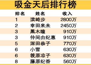 日本一家雜志最近公布“女藝人年收入排行榜”,樂壇天后濱崎步險(xiǎn)勝同門賺2450萬元(人民幣)的師妹幸田來未,以2800萬重登榜首,吸金力驚人!