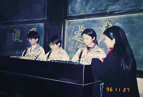 湯唯是班長,又是語文課代表,藝術(shù)天賦很早就表現(xiàn)出來了。1996年11月27日,湯唯與另外兩名同學(xué)代表學(xué)校參加校園之聲職高學(xué)生播音比賽,還獲了獎(jiǎng)!八芟矚g各種文藝方面的活動(dòng),每次的主題班會(huì)都是湯唯與副班長一起主持策劃的!闭f到這班主任肖老師很開心,“只要有她在,我什么都不用操心,只要坐在底下聽就好。她是個(gè)很用功的學(xué)生。湯唯普通話說得很好,學(xué)校的活動(dòng)很多都是她主持的。”