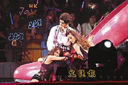 據(jù)香港文匯報(bào)報(bào)道,“周杰倫2007世界巡回演唱會(huì)”香港站的七場演出已于前晚大功告成,周杰倫獻(xiàn)唱《夜曲》時(shí),名模姚書軼和另一性感舞蹈員從旁伴舞,她們不停做出誘惑動(dòng)作,不僅掃摸他身體,更甚是伸手在周杰倫的大腿內(nèi)側(cè)位置掃過去,差點(diǎn)觸及周杰倫重要部位,周杰倫被嚇得用手撥開對方。最搞笑是立刻以手掩護(hù)住下,可能周杰倫給熱情的女伴舞者所帶動(dòng),隨之開放起來,當(dāng)女伴舞者把頭躺在周杰倫的大腿時(shí),他索性把對方的頭按下,差點(diǎn)觸碰到下體,令現(xiàn)場觀眾叫囂不絕。