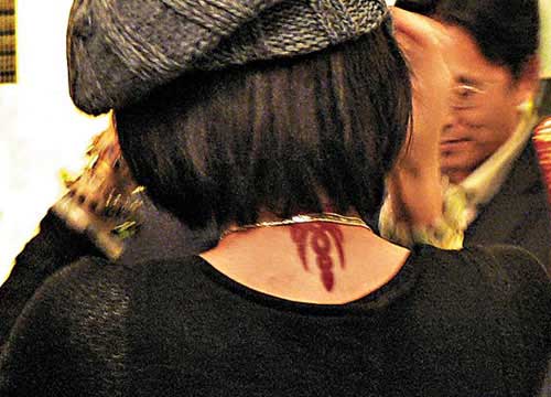 當(dāng)記者發(fā)現(xiàn)她頸部的紅色刺青,她嬌羞地說:“你發(fā)現(xiàn)了啊?這對(duì)我來說意義非常深遠(yuǎn)!痹瓉磉@字是齊秦所經(jīng)營的經(jīng)紀(jì)公司的logo,是“齊”的古字,可見她烙印的“意義”有多深遠(yuǎn)。