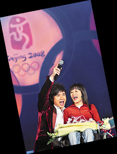 古巨基獲央視與奧委會(huì)邀請(qǐng),出席在北京舉行的新年倒數(shù)晚會(huì),基仔與桑蘭合唱《好想好想》,由于桑蘭需坐輪椅,為遷就她及拉近距離,基仔跪地合唱,場(chǎng)面溫馨。對(duì)于桑蘭的印象,基仔回答:“我覺(jué)得桑蘭非常勇敢和樂(lè)天!绷硗猓性诨顒(dòng)上與劉翔碰面聚舊,并說(shuō):“我最想看到劉翔在跨欄項(xiàng)目中再奪金牌,并希望到時(shí)油機(jī)會(huì)去現(xiàn)場(chǎng)加油!