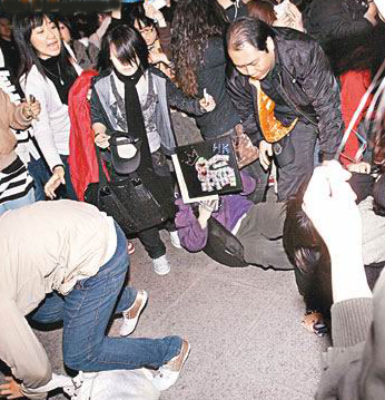 據(jù)香港太陽報(bào)報(bào)道,闊別香港一段時(shí)間的飛輪海,前晚難得四子齊集抵港,數(shù)百粉絲聞風(fēng)進(jìn)行人海式閘內(nèi)、閘外及停車場(chǎng)全面“包抄”狙擊!四子在晚上10時(shí)許出現(xiàn),粉絲即失控蜂擁而上,雖然唱片公司已安排十多名保安人員開路,不過因粉絲太多,數(shù)度出現(xiàn)人壓人的骨牌倒地危險(xiǎn)場(chǎng)面,有女孩被撞到頭貼地不停呼叫,連記者亦紛紛伸手救人,場(chǎng)面相當(dāng)混亂!