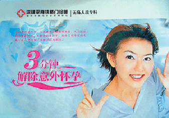 昨日,網(wǎng)友在某論壇爆料,稱孫燕姿舊照被一名為“深圳平南鐵路門診部”的“無痛人流(人工流產(chǎn))?啤北I用成廣告圖片。照片中,孫燕姿身穿藍(lán)色休閑裝,甜蜜大笑,而照片下則寫著“3分鐘解除意外懷孕”。