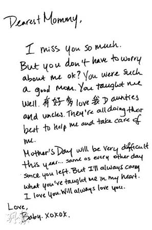 無法要求肥姐再做“母親節(jié)”專訪,所以《明報》轉(zhuǎn)托欣宜把肥姐的愛延續(xù)下去,記者寫到,當(dāng)欣宜靜靜地在寫給媽咪的信時,我看她的眼淚一直在流,心里真的好痛,就因一個病,把一對相依為命的母女永遠(yuǎn)分開了,欣宜就要一個人地走下去,看到她這封信寫著“親愛的媽咪,我好掛念你,但你不用掛心我,你是一位好母親,教導(dǎo)我好好成長,有好多愛我的姨姨與叔叔,他們都盡心盡力照顧我。今年的母親節(jié)對我來說非常之不同,就如你已離開我的每一天一樣,不過我永遠(yuǎn)都記得你教我的一切,你永遠(yuǎn)都在我心里面。我愛你!一直一直的愛你!Baby(肥姐對欣宜的昵稱)”