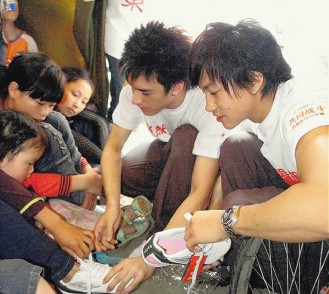 據(jù)臺(tái)灣聯(lián)合報(bào)報(bào)道,在安置地點(diǎn),何潤(rùn)東等一行人熱心慰問(wèn)當(dāng)?shù)厝罕。在?tīng)到當(dāng)?shù)厝酥v述災(zāi)情的時(shí)候,一個(gè)小朋友一直在哭,陳怡蓉馬上走到他身邊,緊緊把孩子抱起來(lái)哄他。何潤(rùn)東也陪著20幾個(gè)小朋友,在帳棚中做游戲,并把他們最需要的鞋子,送到每一位小朋友的手上。